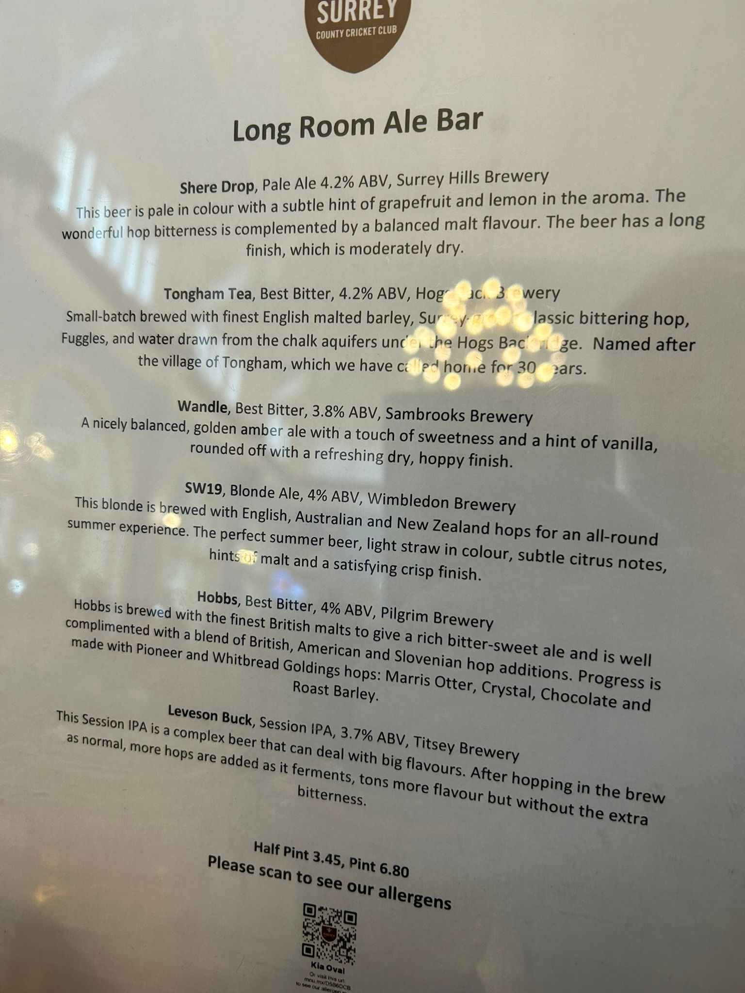 There is quite a strong read-across between Country Championship cricket and cask ale in terms of the devotees - I heard a few gentlemen in the crowd planning their visit to St Albans next weekend for the CAMRA Annual Conference - and the Long Room Bar at the Oval is a shrine to the cask. (Other bars offer the very tasty Reliance Pale Ale from Brixton. I am equally comfortable with either). The dominant tipple is Shere Drop from the Surrey Hills Brewery. I have nothing against Shere Drop, but I get frustrated at my fellow members who wilfully fail to consider what else is on offer. The other offerings rotate a bit. I tried two different pints. Firstly the Leveson Buck from the Titsey Brewery, which is a newcomer to the Passport - and a very interesting looking one up on the North Downs Way - that I will be visiting later this year. Only 3.7% but with a hoppy kick. Then the SW19 Blonde from the Wimbledon Brewery (to which I paid an enjoyable visit last year on their industrial estate premises near Colliers Wood), which was a typically light and sweet summer ale.